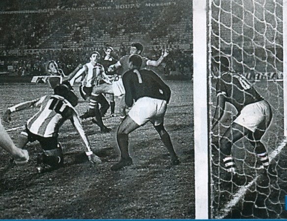 Sudamericano de 1967. los argentinos Artime y Rojas cargan sobre el arco boliviano. Defienden Ágreda, Palenque y Zabalaga en el centro del arco, Issa a punto de contener el balón.
