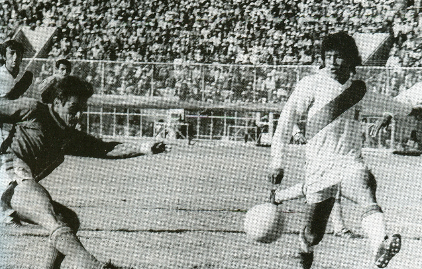 En la Copa América de 1975, Oruro fue por única vez sede oficial de la selección. «Calichín» Morales domina la pelota frente a Perú, Bolivia perdió ese partido 1 a 0.