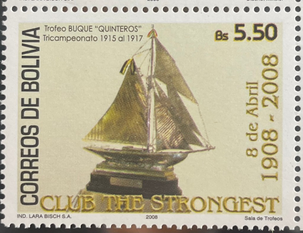 Estampilla de 2008, en ocasión del centenario de The Strongest, con la imagen del famoso trofeo «Buque Quinteros»
