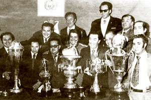 Con los máximos dirigentes del fútbol mundial Joao Havelange de la FIFA (a su izquierda) y Teófilo Salinas de la CSF (a su derecha)