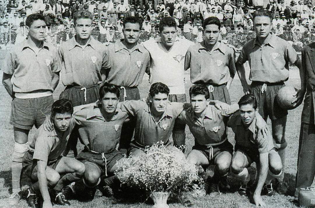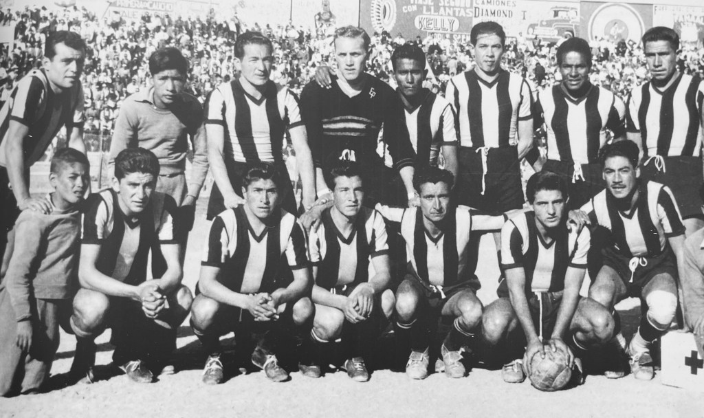 1952. The Strongest campeón nacional: Rivera, Morales, Puig, E. Vargas, Ribero, Gadea y Vargas; Valda, C. Trujillo, A. Trujillo, Robles, Calla y Suárez (foto del libro «Rugido centenario»).