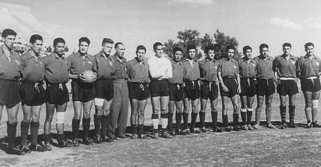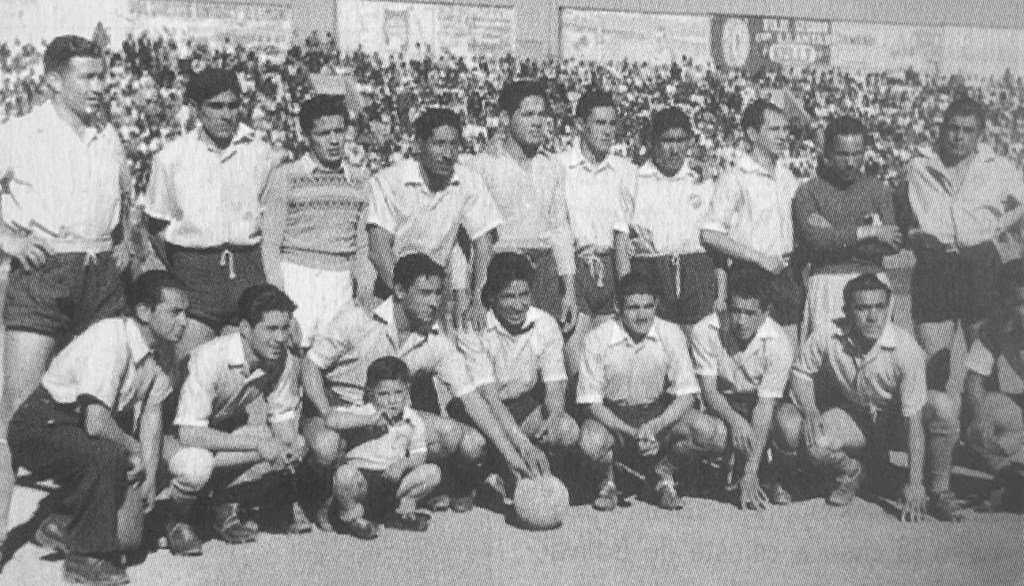 1955. San José campeón nacional: Maida (DT), Valdivia, Honores, Bonifacio, Valdivia, Ágreda y Peláez. Carrión, Escobar, Orellana, Murillo y Maldonado (foto del libro «Vivencias de medio siglo»).