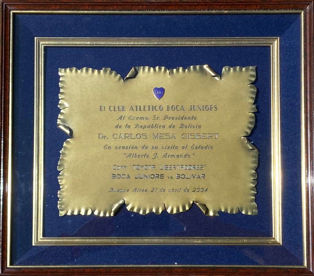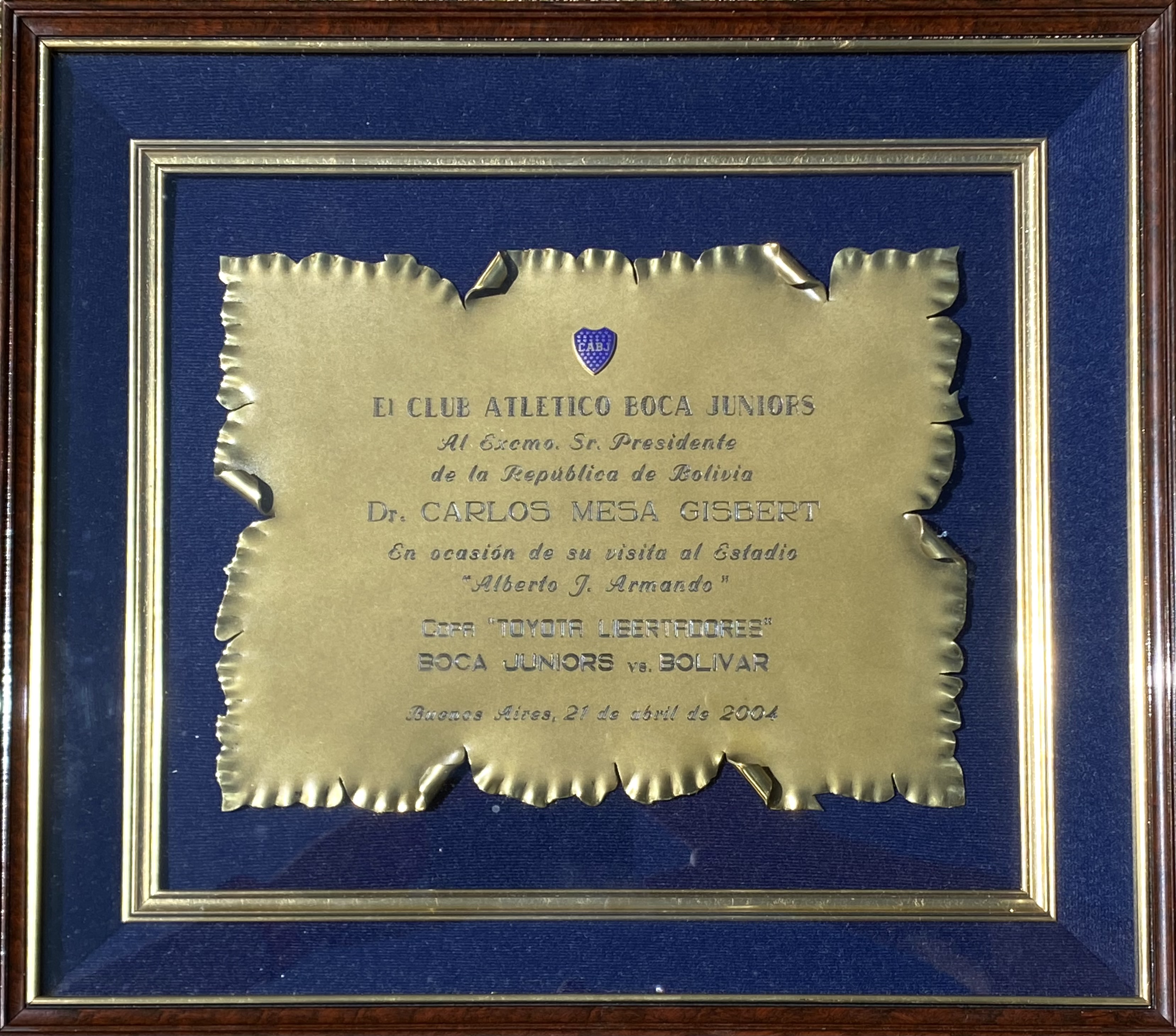 Mauricio Macri presidente de Boca me entregó esta plaqueta al llegar a La Bombonera (cuyo nombre oficial es Alberto J. Armando). Note el lector que hace referencia a un partido de la Libertadores de 21 de abril de 2004, al que yo no asistí. La plaqueta debía decir: Final de la Copa Nissan Sudamericana, 17 de diciembre de 2004. ¿Simplemente un error? ¿Uso de una plaqueta que sobró del citado partido, a la que añadieron mi cargo y mi nombre?: «hacelo, ni cuenta se va a dar»… Un misterio y una anécdota simpática.