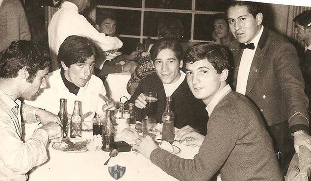 Hugo Falcone, Aldo Rodríguez, Héctor López y José P. Battagliero, jugadores de Atlanta, cenando en un restaurante de La Paz, cuando participaban en la Recopa disputando la Serie B (fotografía, del club Atlanta).