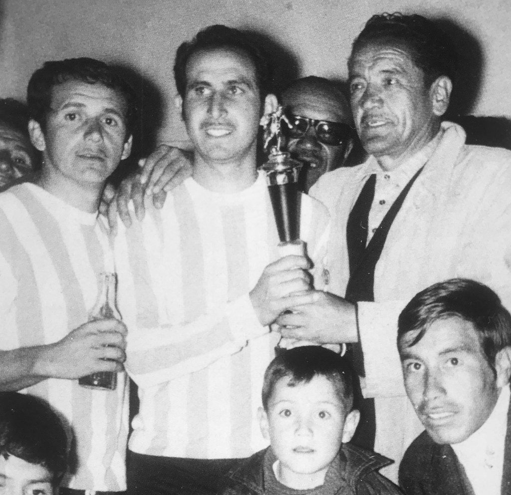 Eliseo Báez con el trofeo de máximo goleador en las manos, a su lado su hermano Ángel (izq.) y el director técnico Félix Deheza (der.).