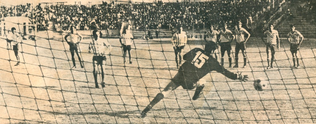 Báez ejecuta el penal y anota el segundo y definitivo tanto que le dio el título continental a Mariscal Santa Cruz.