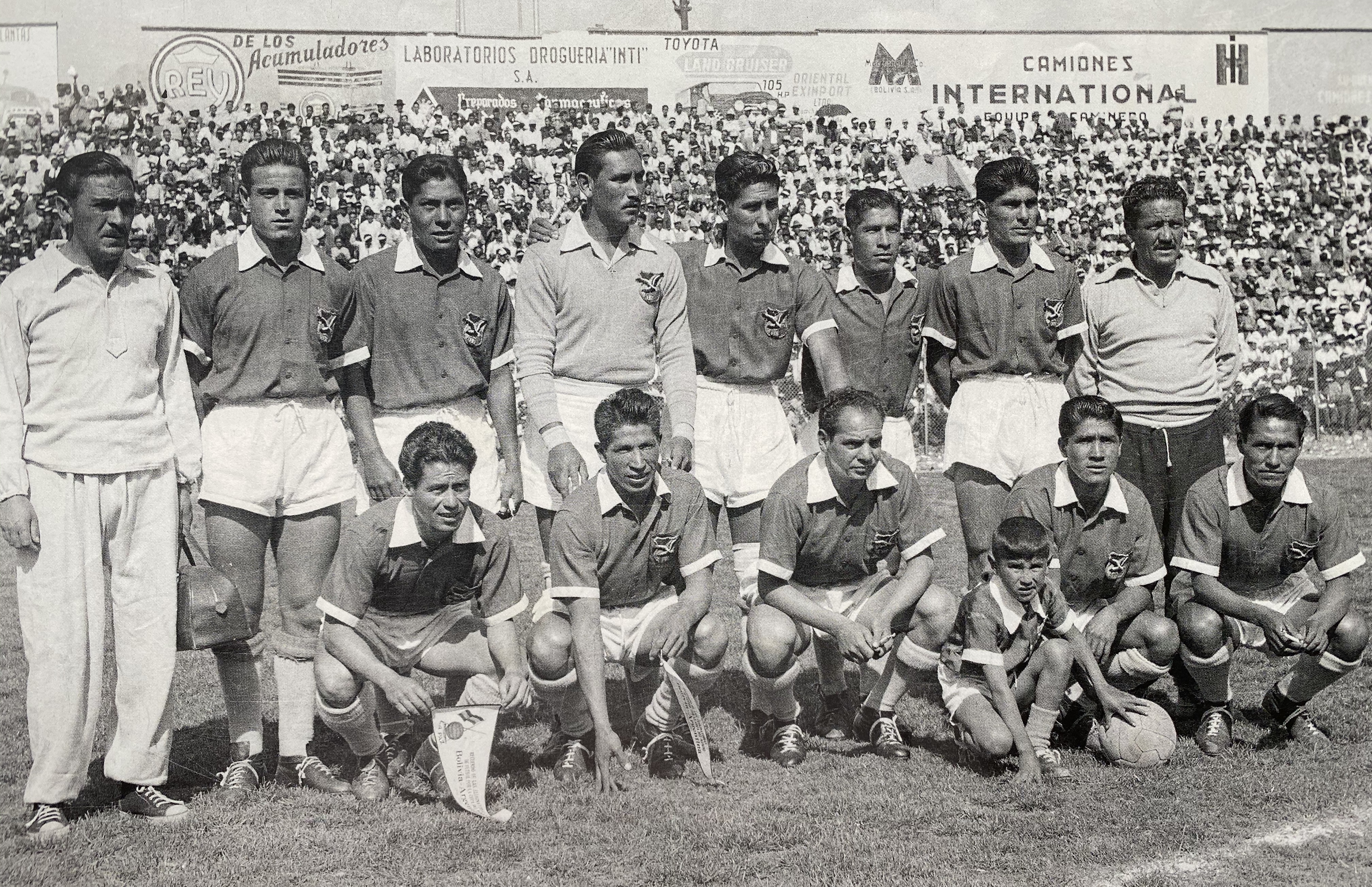 1957. La primera selección boliviana que jugó unas Eliminatorias: Óscar Claure, Max Ramírez, Eustaquio Ortuño, Wilfredo Camacho, Miguel Burgos, Ramón Guillermo Santos y Félix Deheza (DT). De cuclillas: Víctor Brown, Víctor Agustín Ugarte, Mario Mena, Máximo Alcócer y Ricardo Alcón. Esa selección mantuvo el invicto y logró el 100% de los puntos en La Paz.