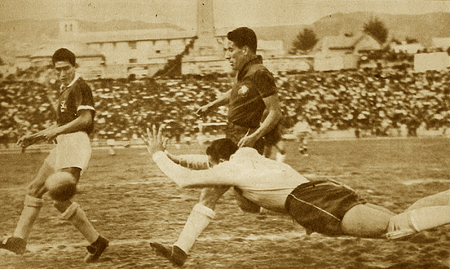 1957. 29 de septiembre. Primer partido jugado por Bolivia en La Paz en una Eliminatoria. 3 a 0 frente a Chile. en la imagen Ramón Guillermo Santos ante la atajada del arquero chileno Quintral.