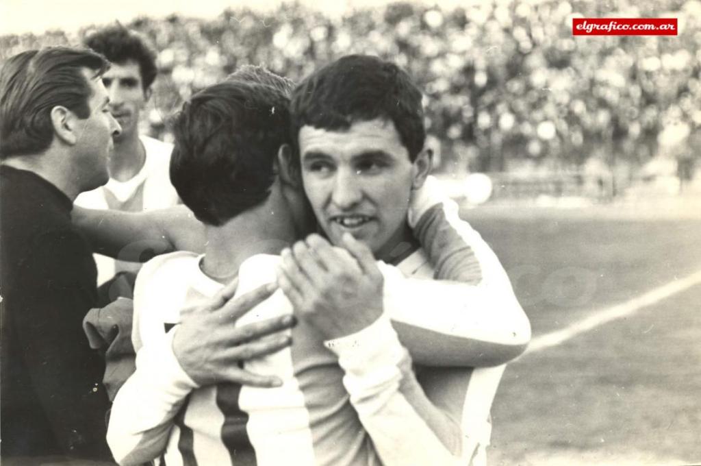 1965. Primera derrota boliviana en La Paz. Argentina ganó por 2 a 1 con dos tantos de Artime (de espaldas) que abraza a Óscar Más. En la imagen Roma y Rattín (foto de la revista El Gráfico)