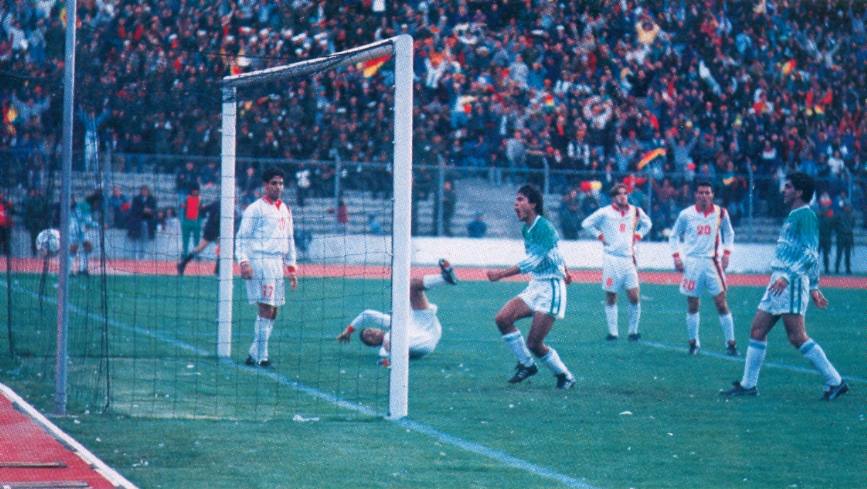 1993, la mejor Eliminatoria jugada por Bolivia en su historia, clasificación incluida. En la imagen el partido Bolivia 2 Brasil 0, Etcheverry va rumbo al gol histórico que rompió 40 años de invicto brasileño en las Eliminatorias. Esta selección obtuvo el 100% de los puntos como local.