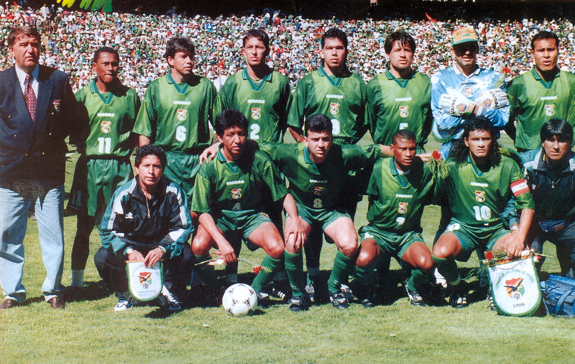 1993. La mejor selección nacional de la historia, la que hizo la mejor actuación en Eliminatorias, clasificando al mundial de 1994. Luis Héctor Cristaldo, Gustavo Domingo Quinteros, Miguel Ángel Rimba, Carlos Leonel Trucco y Marcos Sandy. De cuclillas: Erwin Sánchez, William Ramallo, Julio César Baldivieso, Carlos Borja, Milton Melgar y Marco Antonio Etcheverry.