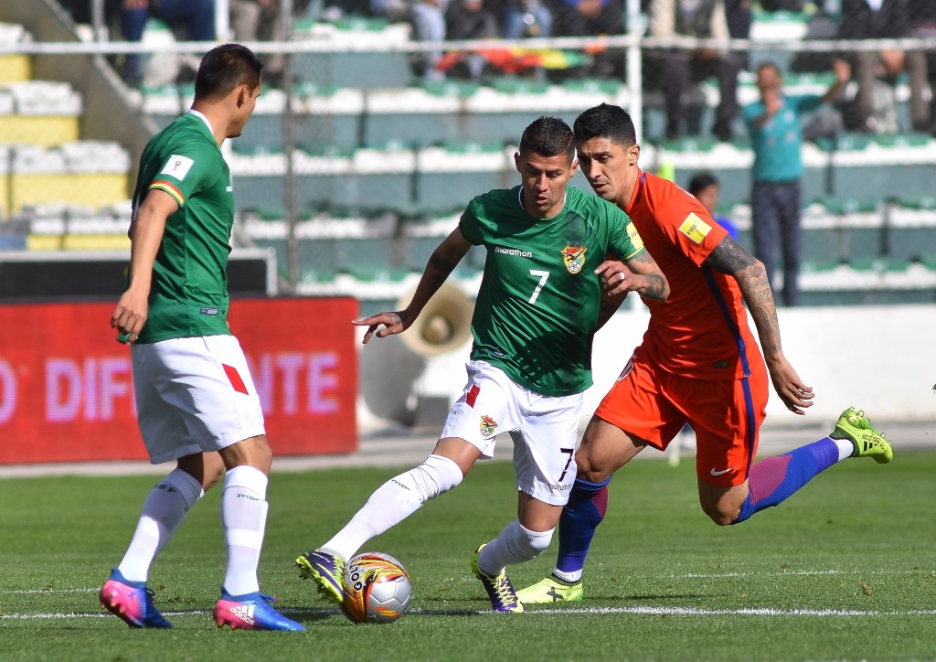 2017. Uno de los 5 triunfos (el mayor número en una Eliminatoria en La Paz) que la selección obtuvo en la Eliminatoria Rusia 2018. Bolivia 1 Chile 0. El héroe de la jornada, autor del gol, Juan Carlos Arce domina el balón.
