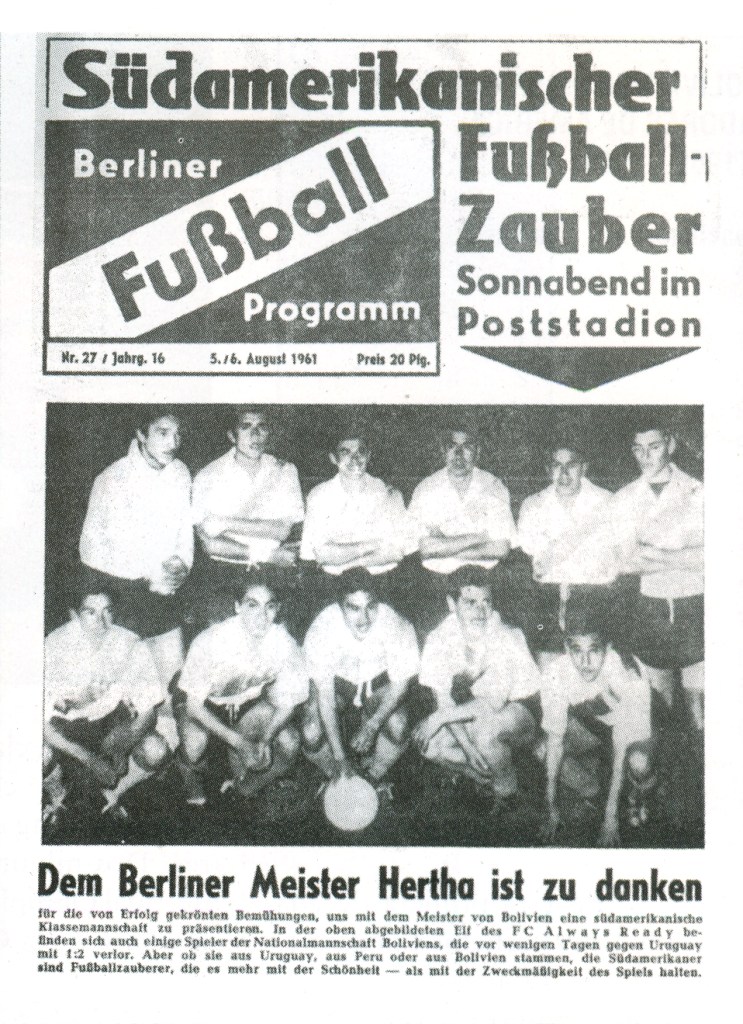 El viaje duró desde el 1º hasta el 5 de agosto día en que jugó su primer partido (cinco agotadoras jornadas volando con ocho escalas entre La Paz y Berlín), . Fue frente al Hertha con una derrota por 5 goles a 2. Le cupo a Del Llano anotar el primer gol de un equipo boliviano en tierras europeas (minuto 25 del partido)..