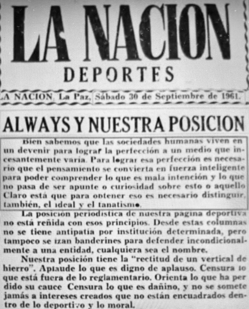 Always formó con: Cobo; Claure, Ruiz y Rocabado; Muzio y Fresco; Blacutt, Valda, López, Escobar y Domínguez (Cortez).