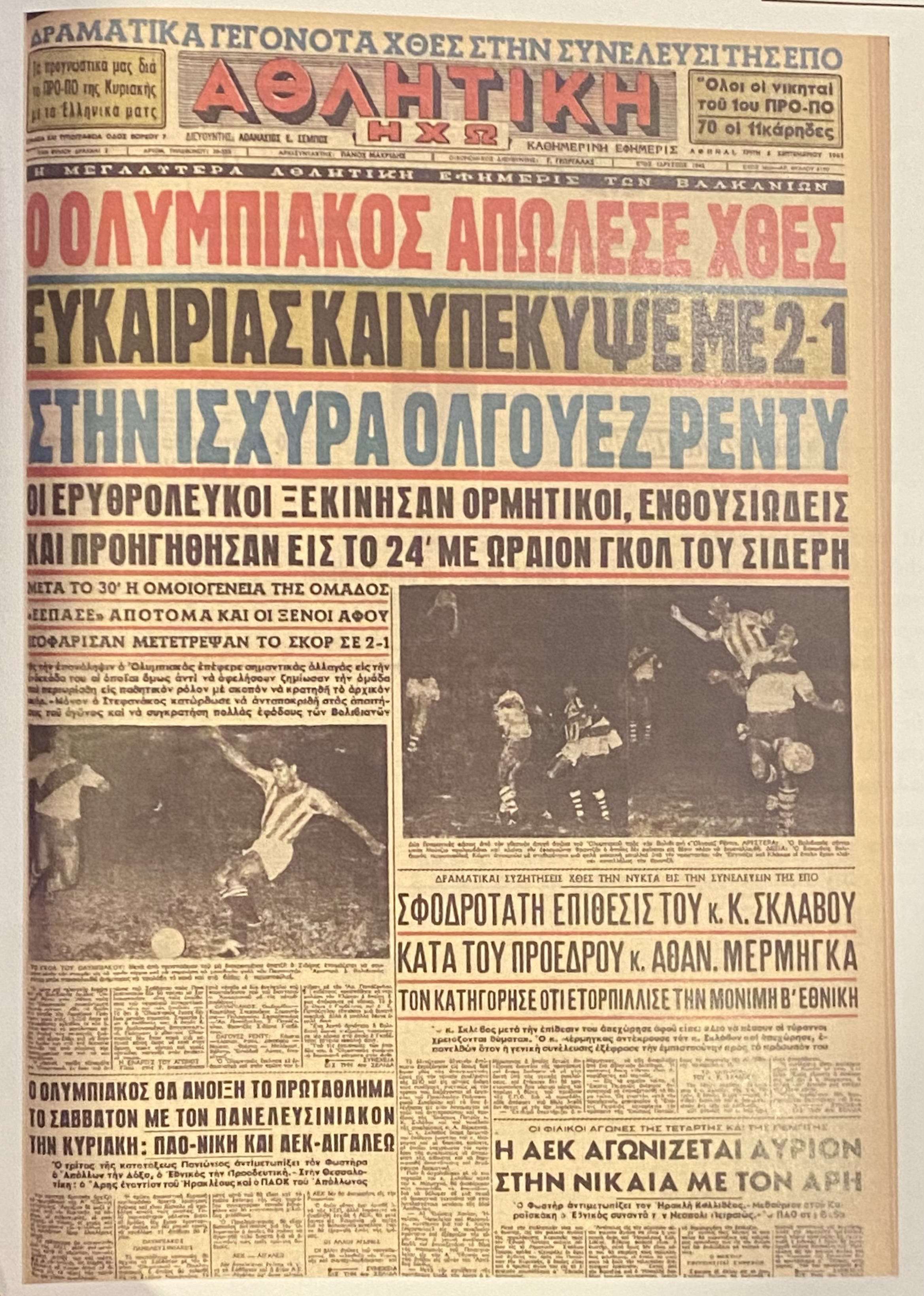 El 4 de septiembre, ante 15.000 espectadores en el Estadio Apóstoles Nikolaïdisen Atenas, el CAR enfrentó al Olimpiakos, subcampeón griego y el equipo más popular del país, que meses antes había derrotado al Santos de Pelé. A los 24 minutos Sideris (226 goles en el fútbol de primera división) abrió el marcador, Always mantuvo la calma y a los 33 empató Escobar con asistencia de Cortez desde una de las puntas. El broche de oro lo puso un adolescente Blacutt con apenas 17 años que a los 41anotó el segundo colocando la bola en el ángulo del arco defendido por Sfairopoulos. El sufrido segundo tiempo, tuvo en Cobo a la estrella que mantuvo cerrado el arco boliviano.