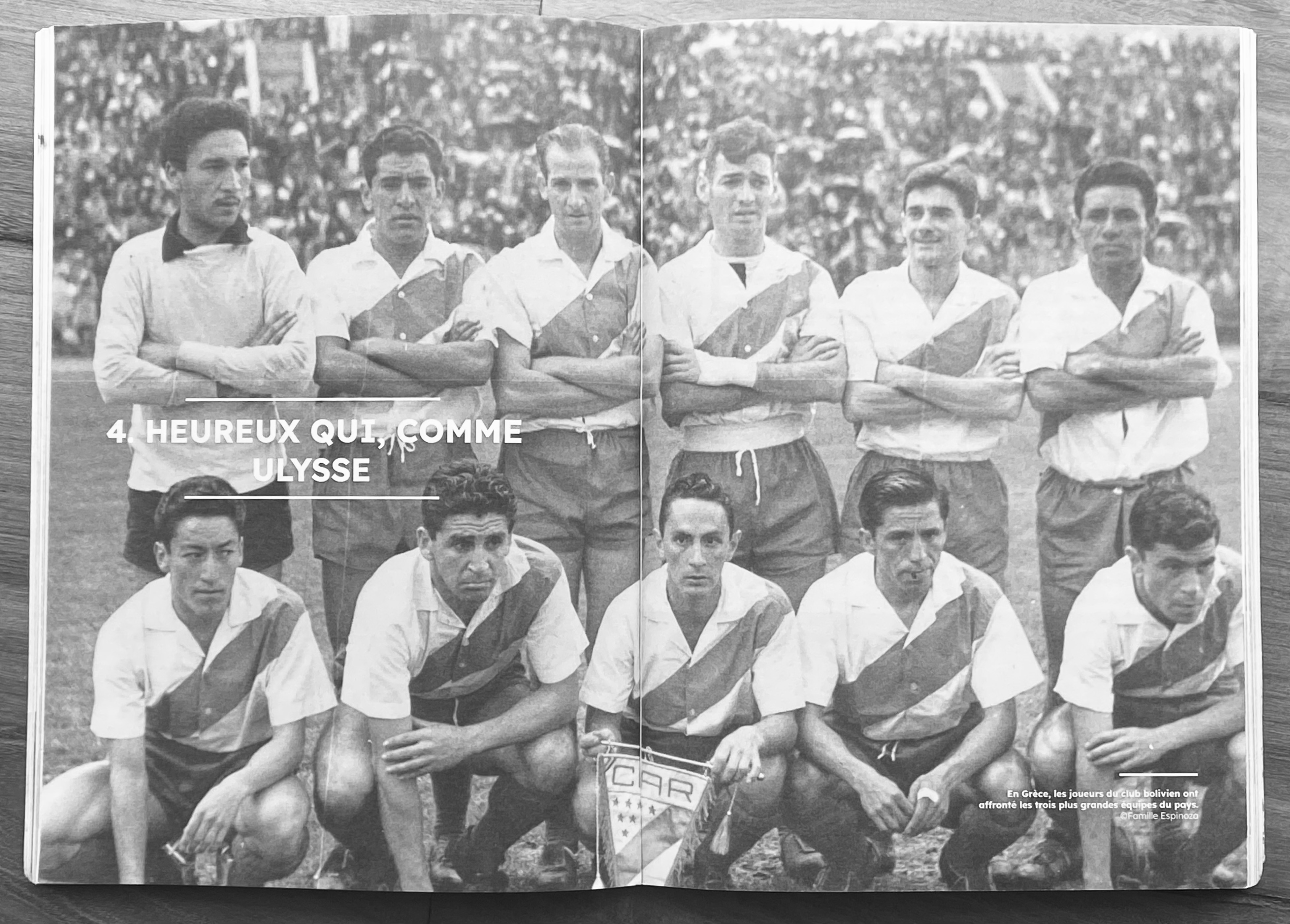 Imagen del comienzo de uno de los capítulos del libro Au-delà des Andes de Thomas Allain bajo el título «Feliz, quien como Ulises». De pie: Griseldo Cobo, Rolando Vargas, Mario Dimeglio, Eduardo Espinoza, Ricardo Muzio y Eusebio Domínguez. De cuclillas: Ramiro Blacutt, Freddy Valda, Carlos Del LLano, Armando Escobar y Rómulo Cortez.