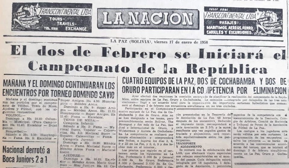 Oruro: San José (3º en 1957) e Internacional (6º en 1957). En este caso, respetando la clasificación del año anterior, le debió haber correspondido jugar a Bata que obtuvo el 4º lugar, pero no fue así.