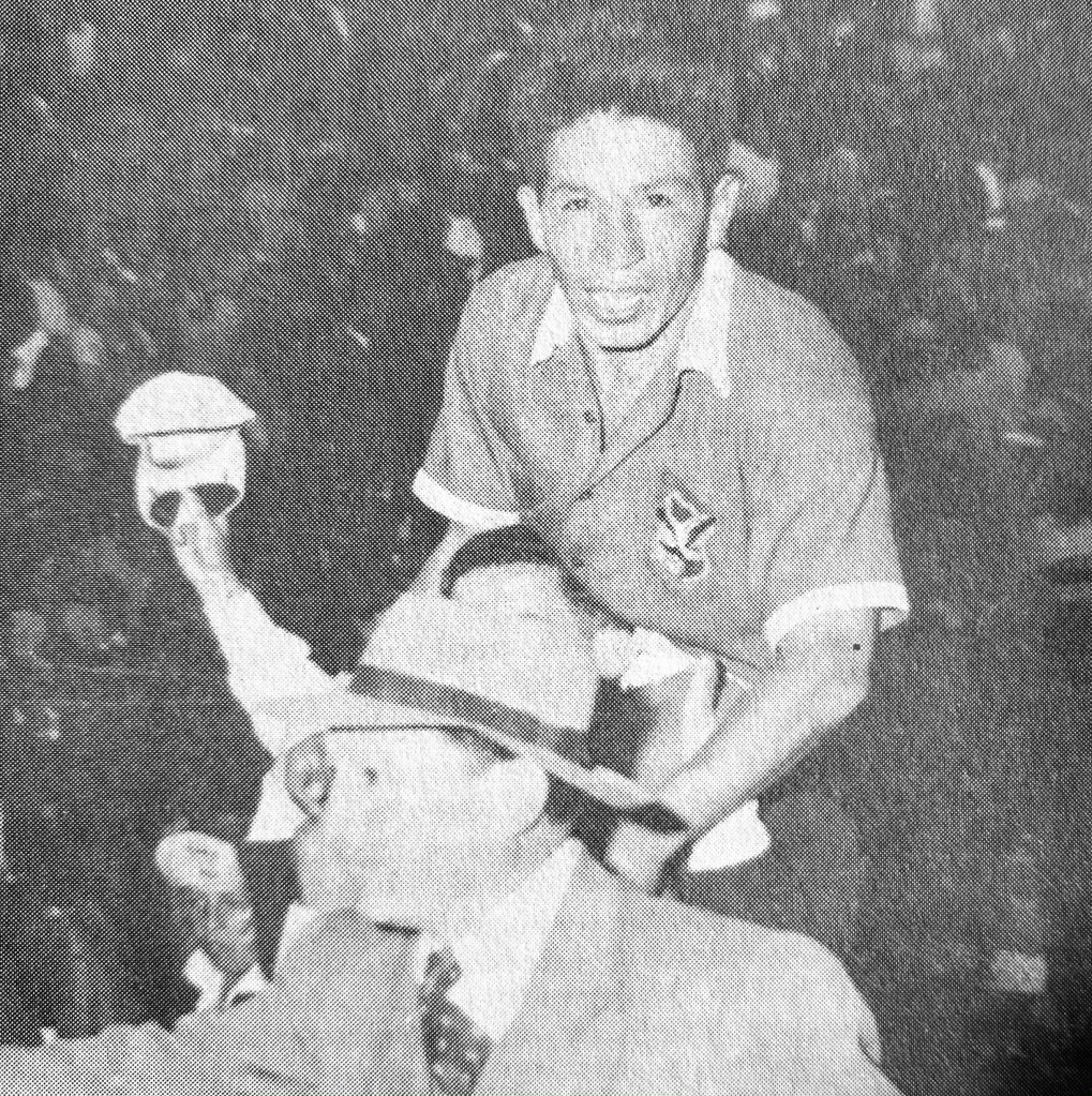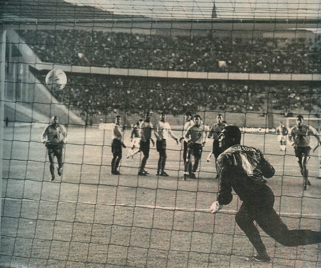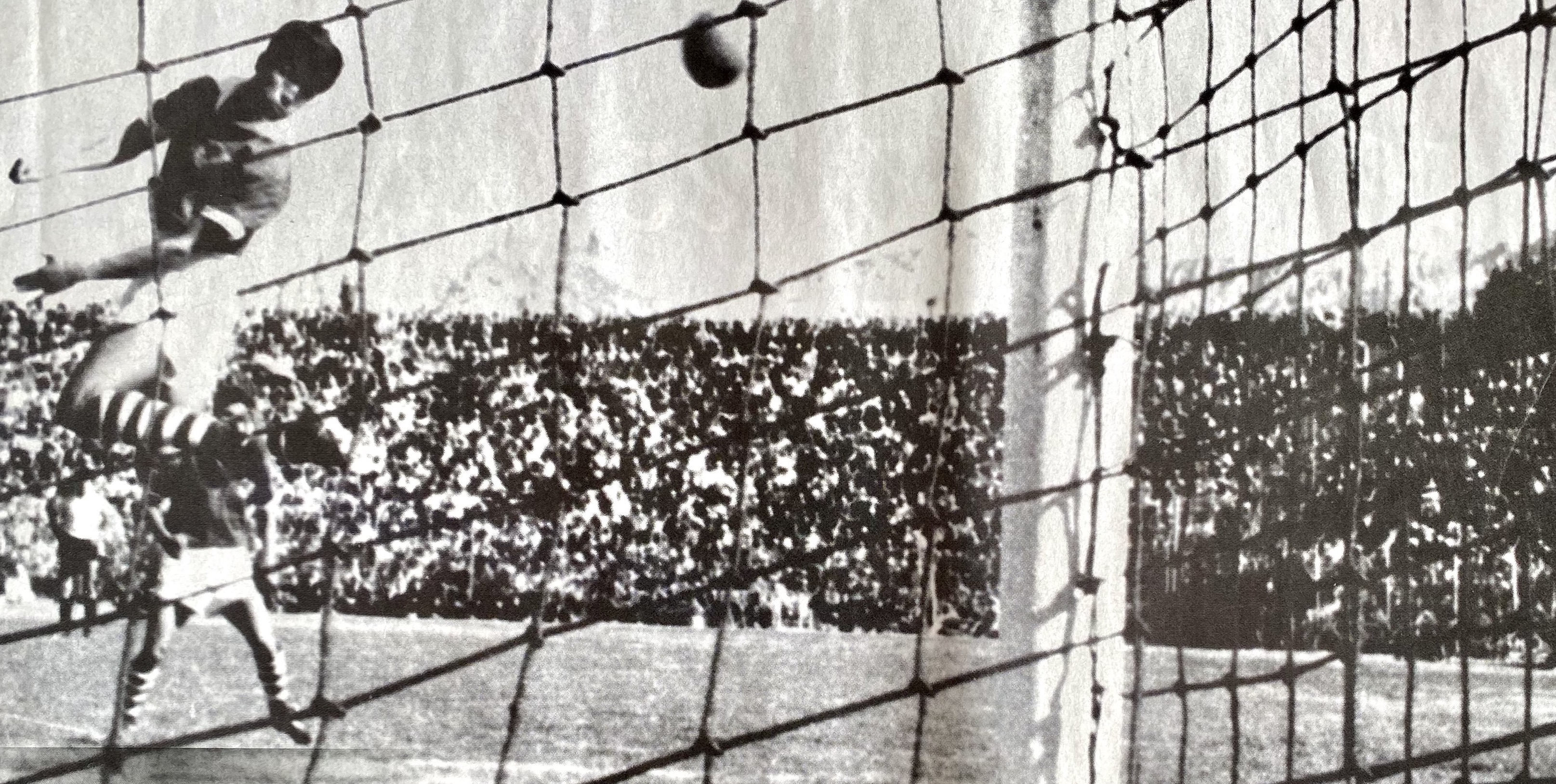 Máximo Tutula Alcócer, segundo máximo goleador de la verde. En la imagen anota el segundo gol del 3 a 2 de Bolivia contra Perú en 1963 (foto L. Flores).