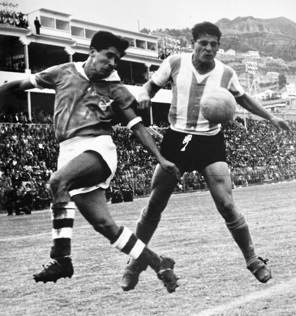 Wilfredo Camacho en su partido para la historia, el 3 a 2 a Argentina en 1963. Allí anotó el gol decisivo para el título boliviano. En la imagen disputa el balón con Zárate de la albiceleste (foto, libro «50 años de la epopeya»).