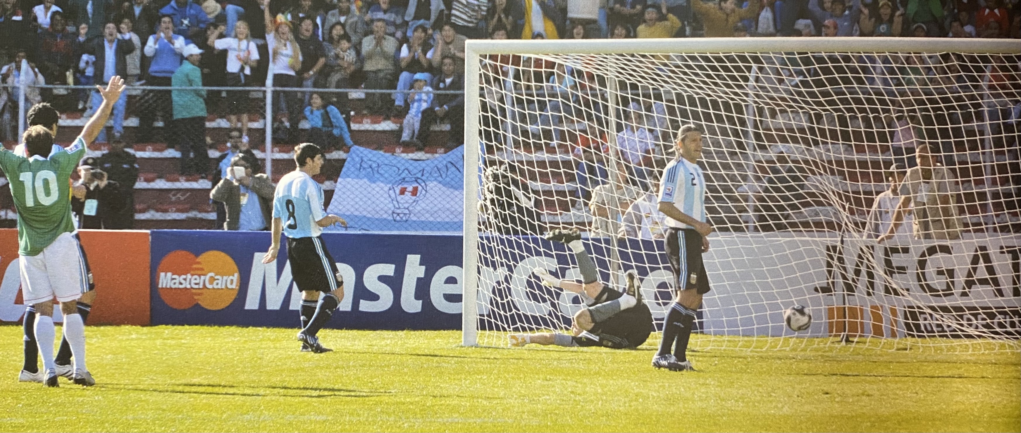 A los 11 minutos comenzó el baile. Una escapada de García, pase a la izquierda a Botero que le hizo un toque rasante a Martins quien, después de un amague, la impulsó casi desde el suelo con la punta del botín derecho. Un 1 a 0 prometedor. A Los 23 parecía que las cosas se complicaban. Recibió Luis González después de varios forcejeos de la defensa boliviana, estaba a casi treinta metros del arco, ensayó un remate bajo y no muy fuerte, Arias la esperó mansa pero la pelota dio un pique un par de metros antes y le pasó por encima del cuerpo, 1 a 1. Era un espejismo para los argentinos, solo eso. A los 32 Gatty disparó sobre el arco, Carrizo respondió mal, la pelota le rebotó, oportunidad para Botero que la colocó al centro de taco para Martins, lo bloqueó Zanetti y salió frente a Da Rosa, en el encontronazo cometió penal.