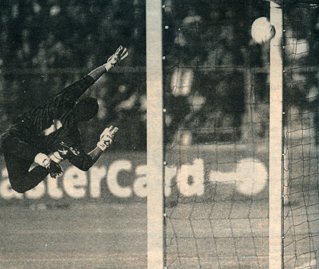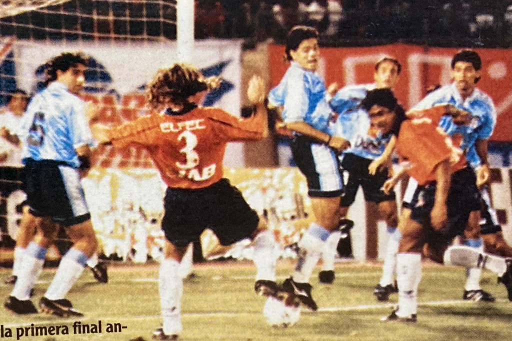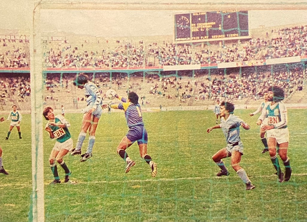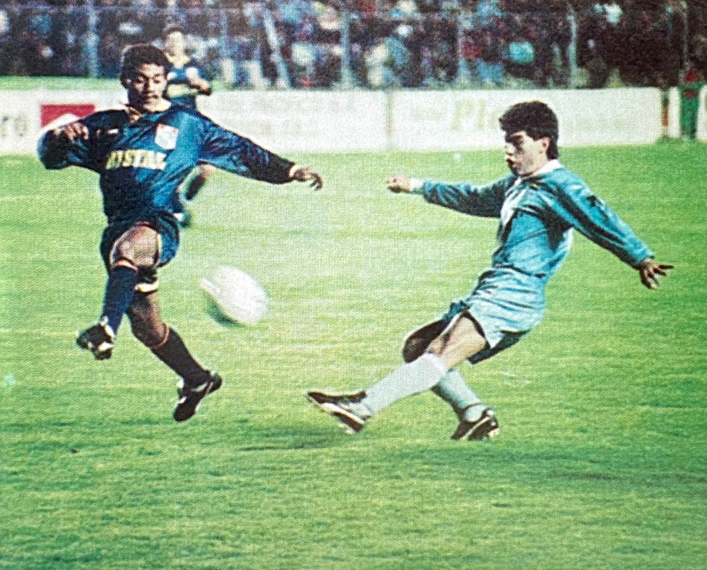1995, Bolívar enfrentó a Sporting Cristal, en la imagen Richard Cueto, anota el gol de apertura. El partido terminó 1 a 1.