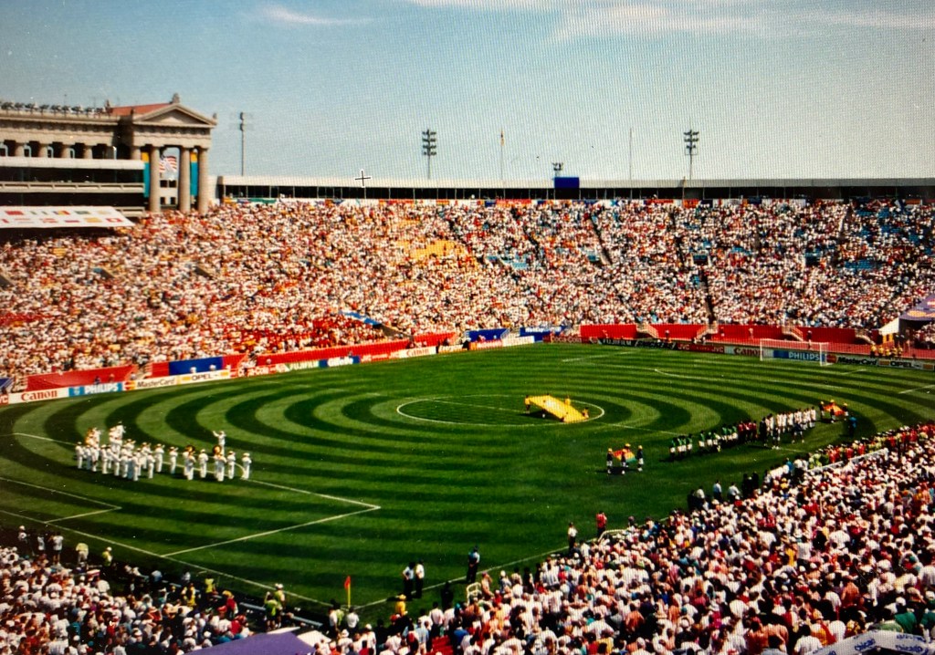 1994, momento de los himnos en Chicago. Las selecciones de Bolivia y Alemania formadas antes del partido.
