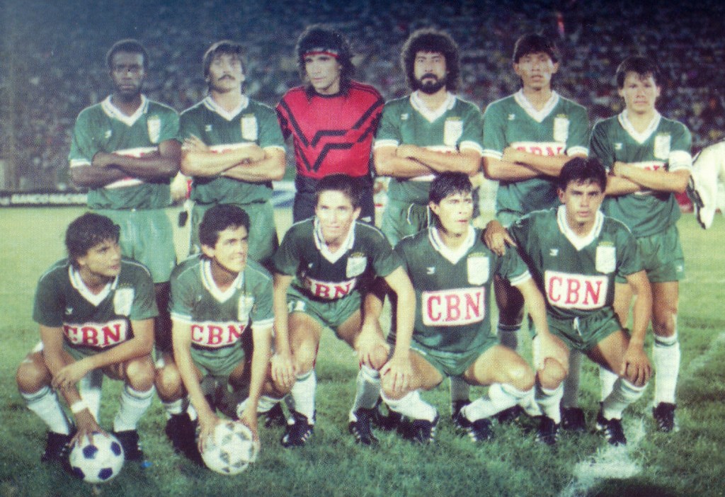 The Strongest en 1990, disputó la Libertadores de ese año y pasó a segunda fase. En la foto Coronado, Martínez, Troncoso, Illanes, Fontana y Gariazu. De cuclillas: Jimeénez, Orellana, Arce, Ayaviri y Ortega.