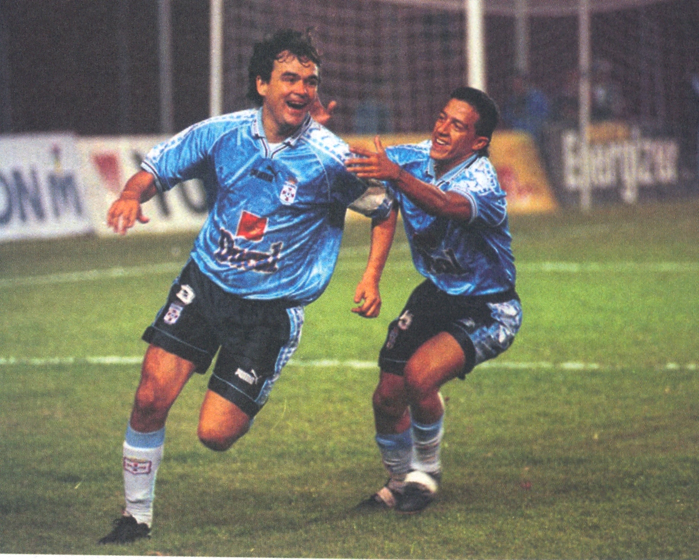 1995, Bolívar enfrentó a Sporting Cristal, en la imagen Richard Cueto, anota el gol de apertura. El partido terminó 1 a 1.