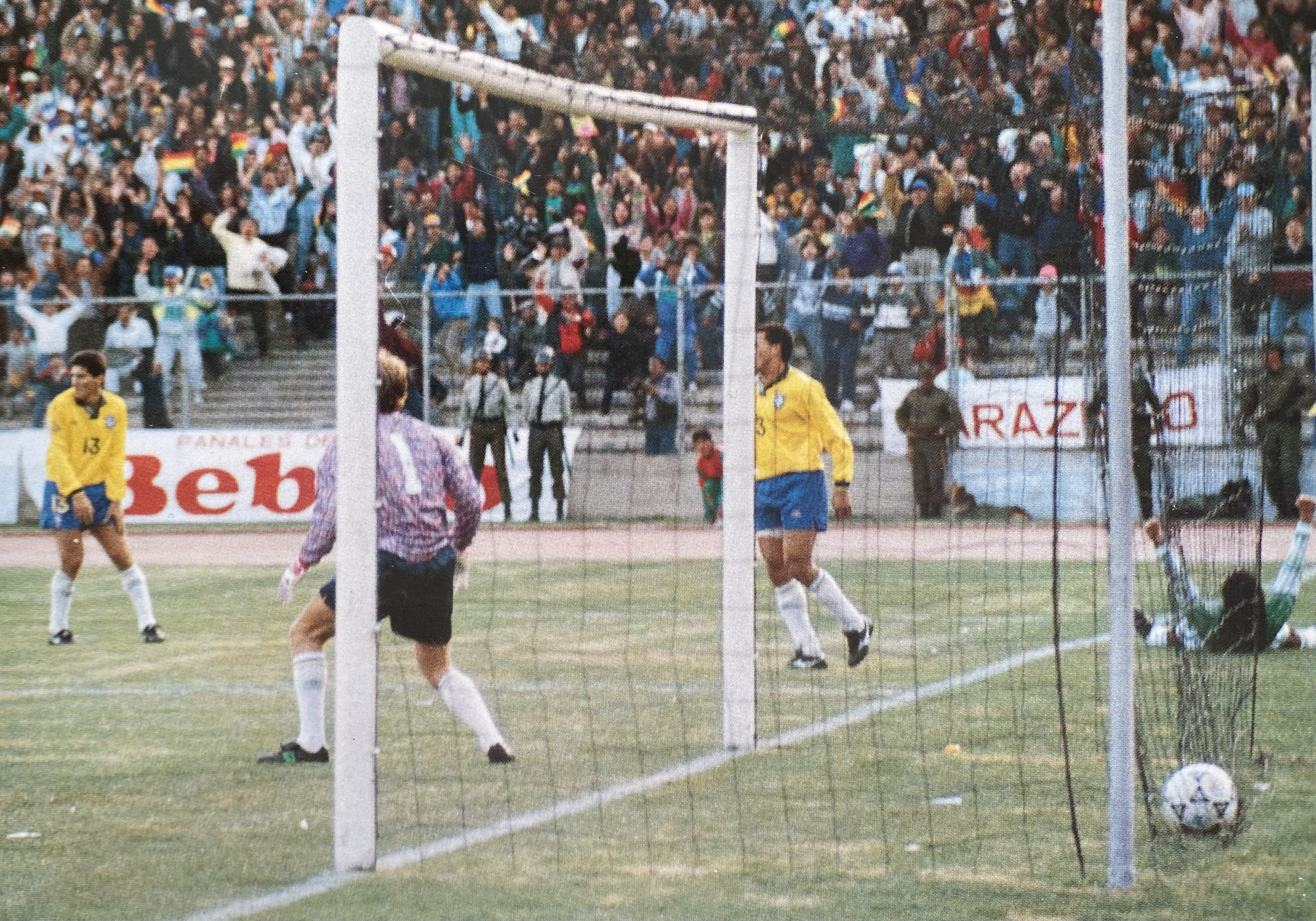 El gol más importante de la historia de la selección. Etcheverry, al extremo derecho celebra el tanto. los brasileños no se la pueden creer. Bolivia 1 Brasil 0, el partido terminaría 2 a 0.