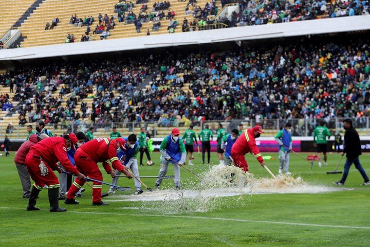 Si bien es verdad que La Paz soportó una intensa granizada dos horas antes del encuentro, el campo quedó completamente anegado dando la impresión de que el sistema de drenaje no funcionó. Ante esa evidencia, vimos el penoso espectáculo de docenas de esforzados funcionarios que sacaban el agua en baldes o con precarios limpiadores de piso con borde de goma, de los que se usan a nivel doméstico No alcanzó, el partido se jugó en condiciones precarias con grandes charcos en varias partes de la cancha.