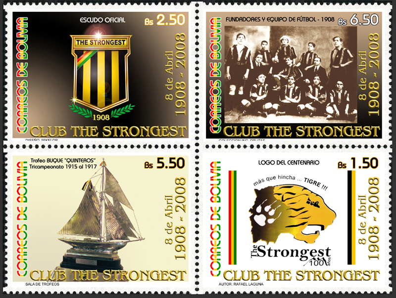 Serie de 4 estampillas dedicadas al centenario de The Strongest 1908-2008. Muy bien lograda. 1 con el escudo clásico del club, hoy modificado. 1 con una imagen del equipo de fútbol de 1908. 1 con la imagen del trofeo más bello que guarda la institución, el denominado «Buque Quinteros» recibido por haber ganado el tricampeonato 1915-1916 y 1917 y la última con el logo del centenario con la imagen de un tigre rugiente, producto de un concurso que ganó el diseñador Laguna.