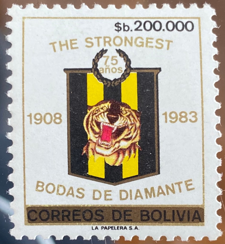 1 sello en homenaje a las bodas de diamante (75 años) de The Strongest 1908-1983. Vale la pena anotar que el Tigre es el único club boliviano que ha merecido estampillas en su honor, no hay ningún otro club profesional del país al que le hayan dedicado una estampilla.