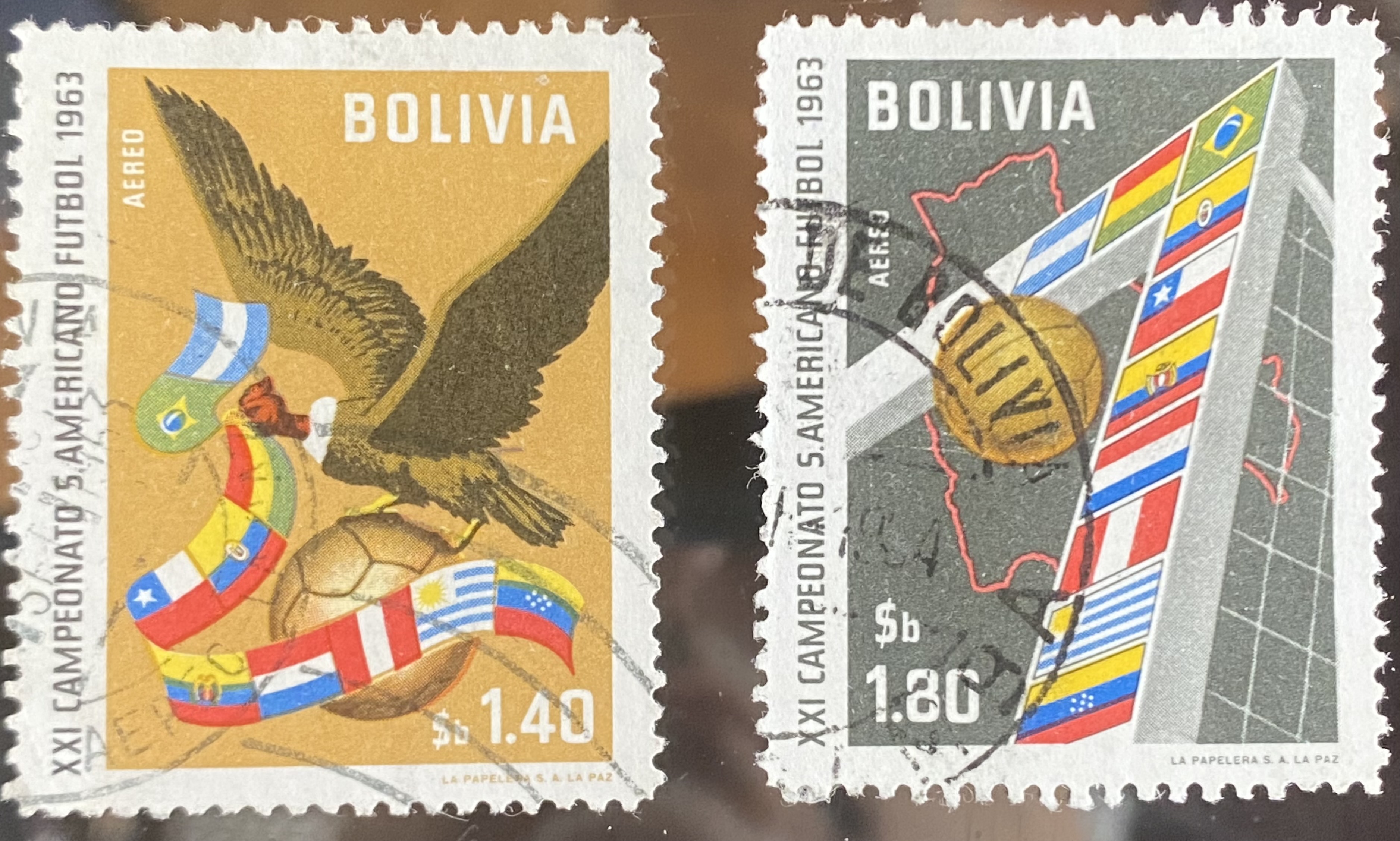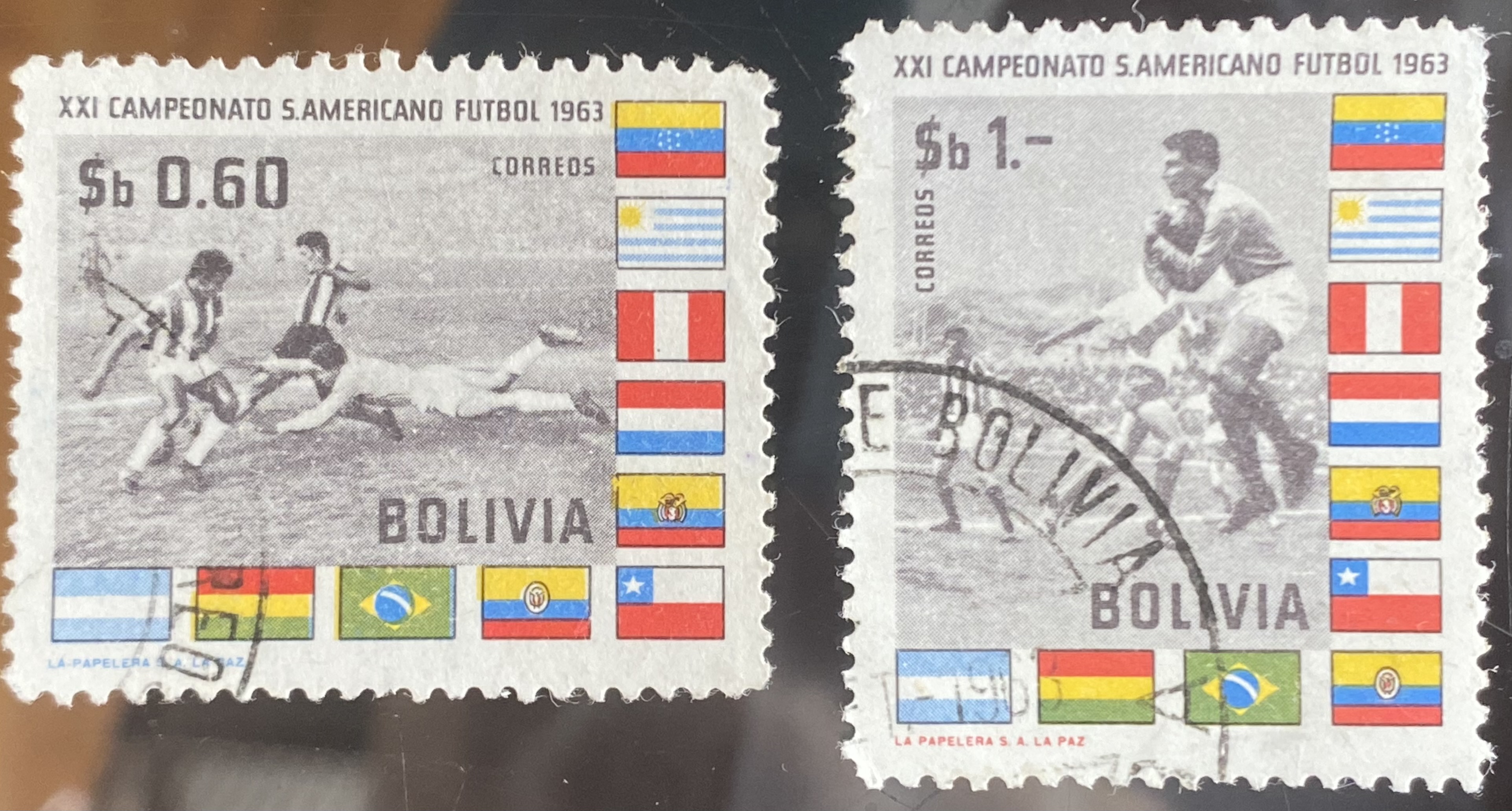 Serie de 4 estampillas dedicadas al XXI Campeonato Sudamericano de 1963 (Copa América) disputado en Bolivia. Se emitió antes del torneo por lo que no es un homenaje a los campeones, sino una referencia a la competencia. Las fotografías de las 2 primeras estampillas son secuencias de campeonatos locales, no de partidos de selección.