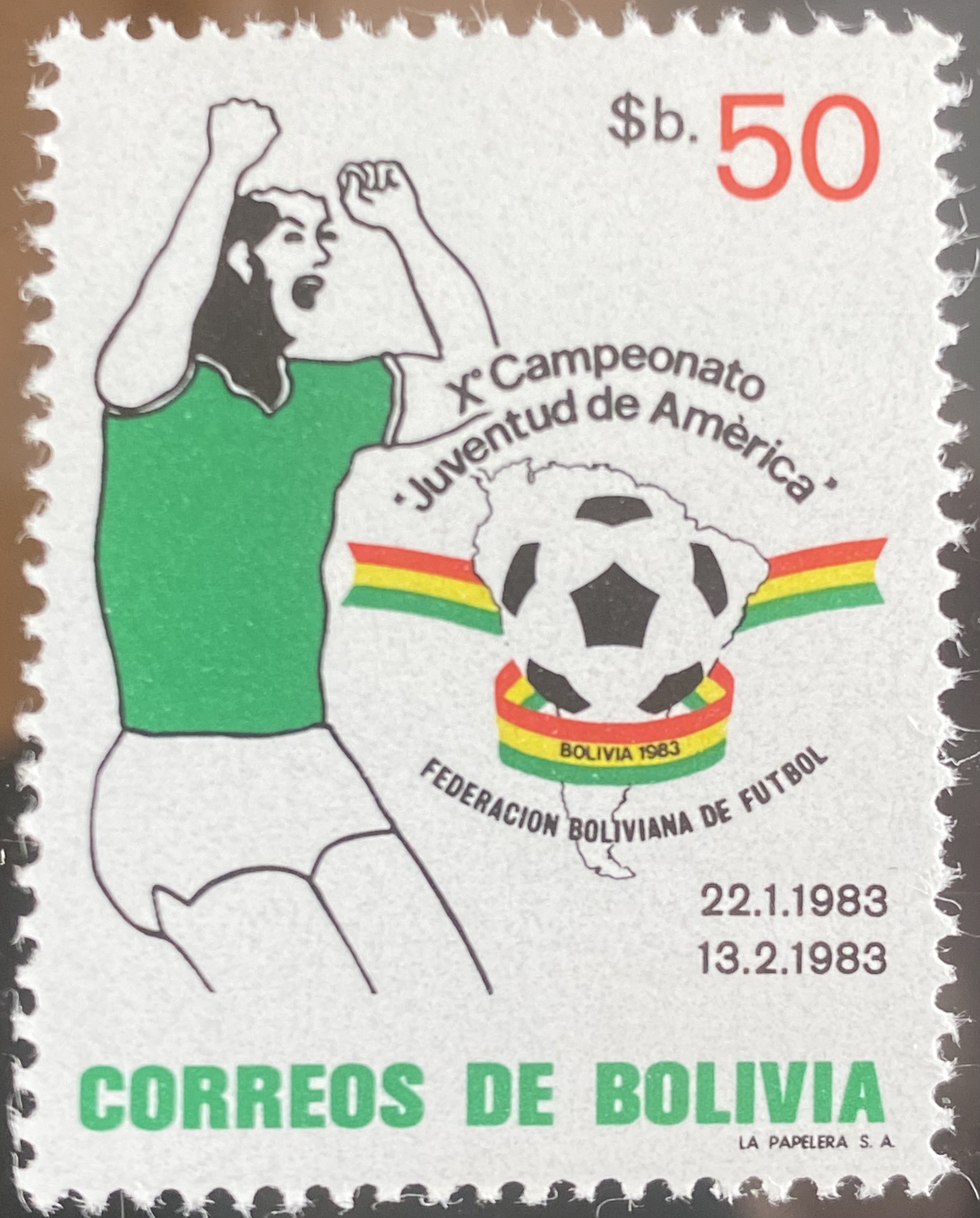 1 estampilla dedicada al X Campeonato «Juventud de América» disputado en Bolivia en 1983. El nombre del torneo era también: «Campeonato Sudamericano sub-20» de 1983. Valga subrayar, sin embargo, que la CONMEBOL reconoce con el nombre de «Juventud de América» a los torneos sudamericanos sub-20 y que dos decretos del gobierno de entonces (19323 y 19382) denominaban dicho torneo como campeonato «Juventud de América».