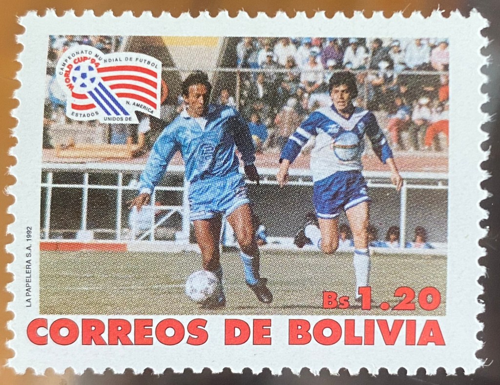 Tiempo antes del Mundial de EE.UU. se emitió 1 sello vinculado a esa competencia. La peculiaridad es que en la imagen hay una secuencia de un partido entre Bolívar y San José en la que se distingue a Vladimir Soria que sería, curiosamente, uno de los jugadores bolivianos que disputó 2 años después el Mundial de 1994.