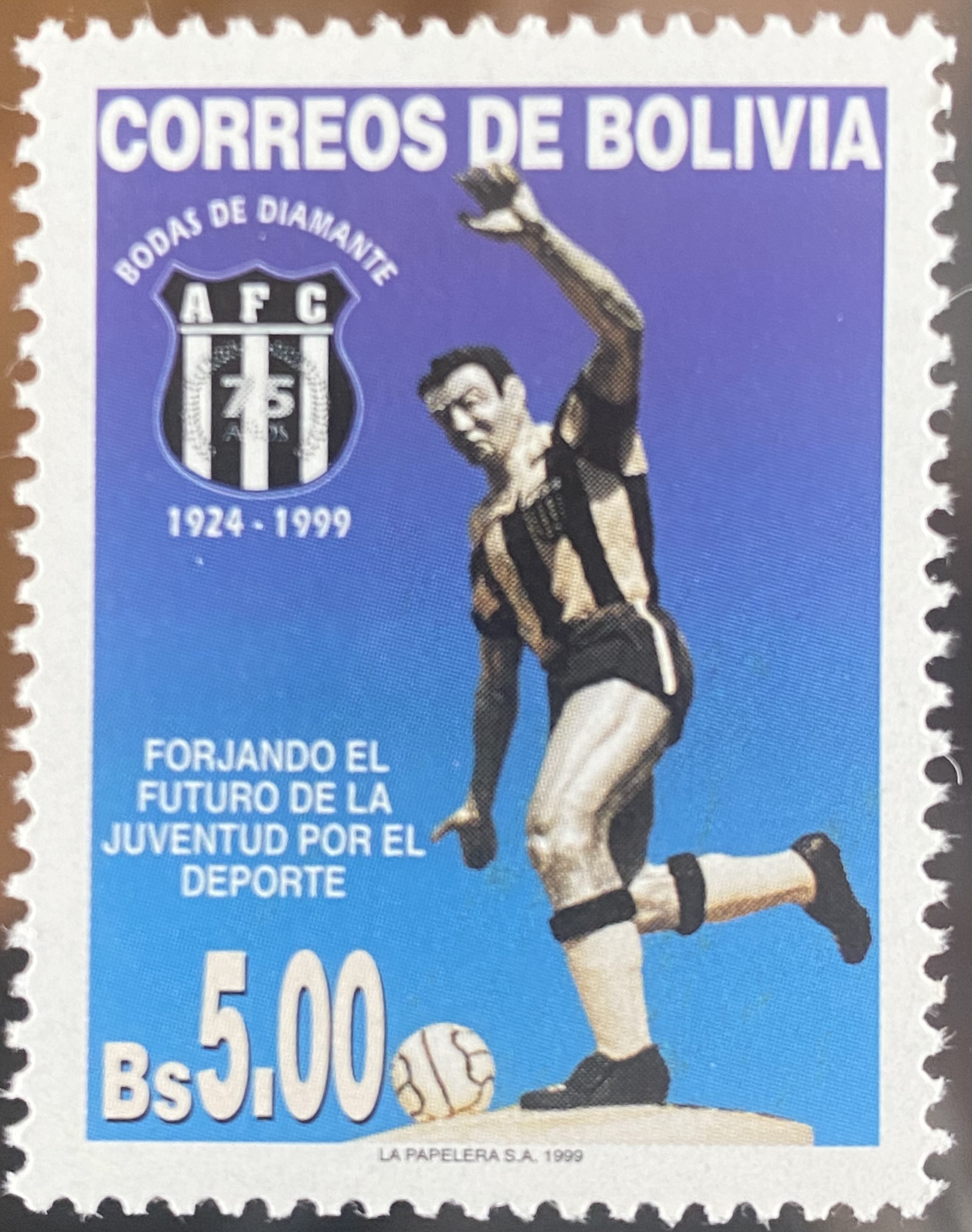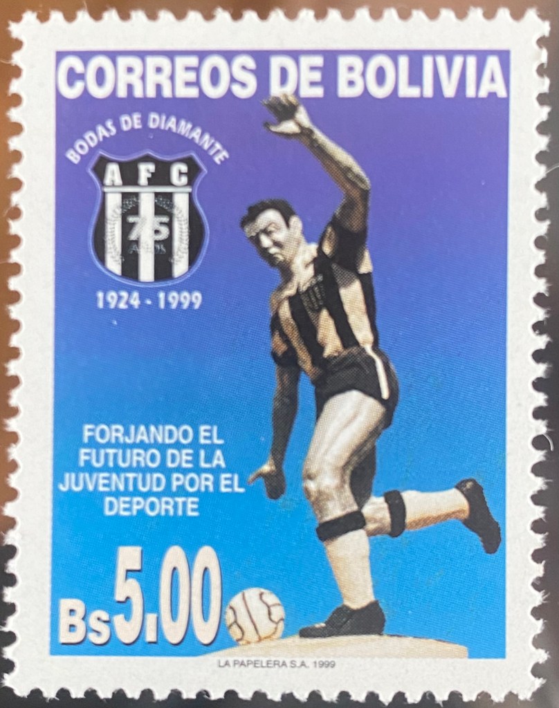 1 estampilla dedicada a Víctor Agustín Ugarte, para muchos el mejor jugador de la historia del fútbol boliviano. Es el único sello en homenaje a un jugador en toda la filatelia nacional. La imagen muestra al «maestro» vistiendo la casaca de la Verde. Hizo casi toda su carrera en Bolívar.