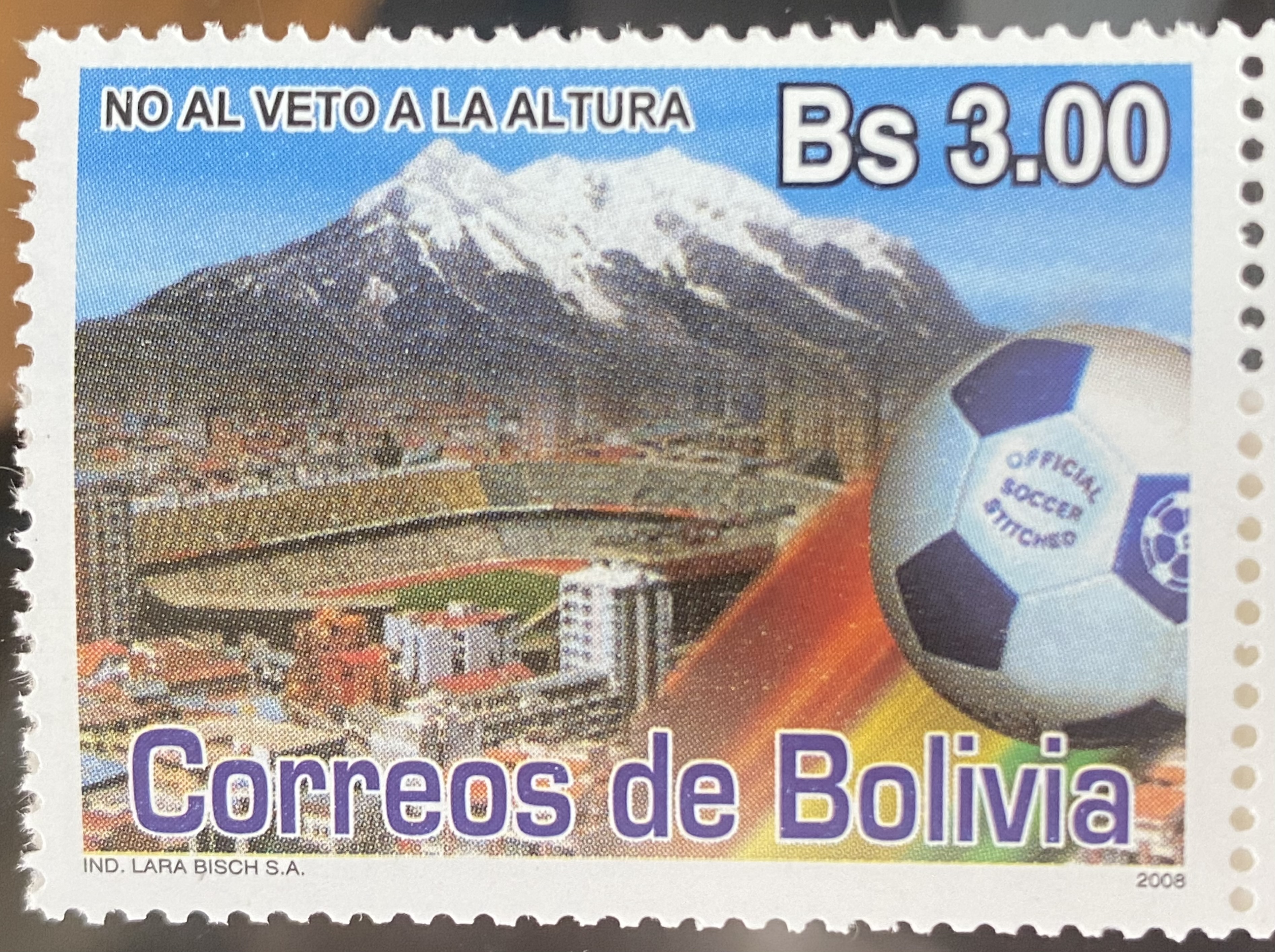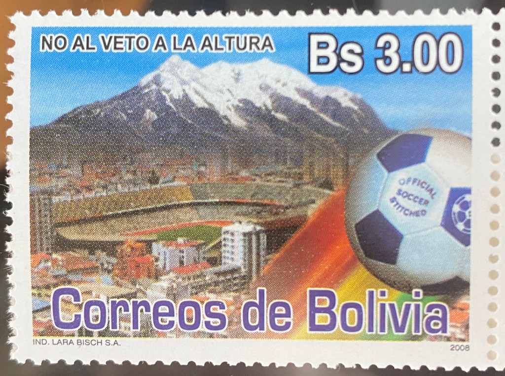 1 estampilla que celebra el triunfo de Bolivia contra el veto a la altura. Proceso que se logró en dos etapas, la primera en el periodo 1995-1996 y la segunda en 2007. Esa importante gestión realizada por Bolivia con equipos profesionales interdisciplinarios, garantizó que se respete la práctica de encuentros internacionales de selecciones en La Paz. En la imagen, el simbólico Illimani y el estadio Siles, sede prácticamente oficial de los partidos puntuables de la selección boliviana.