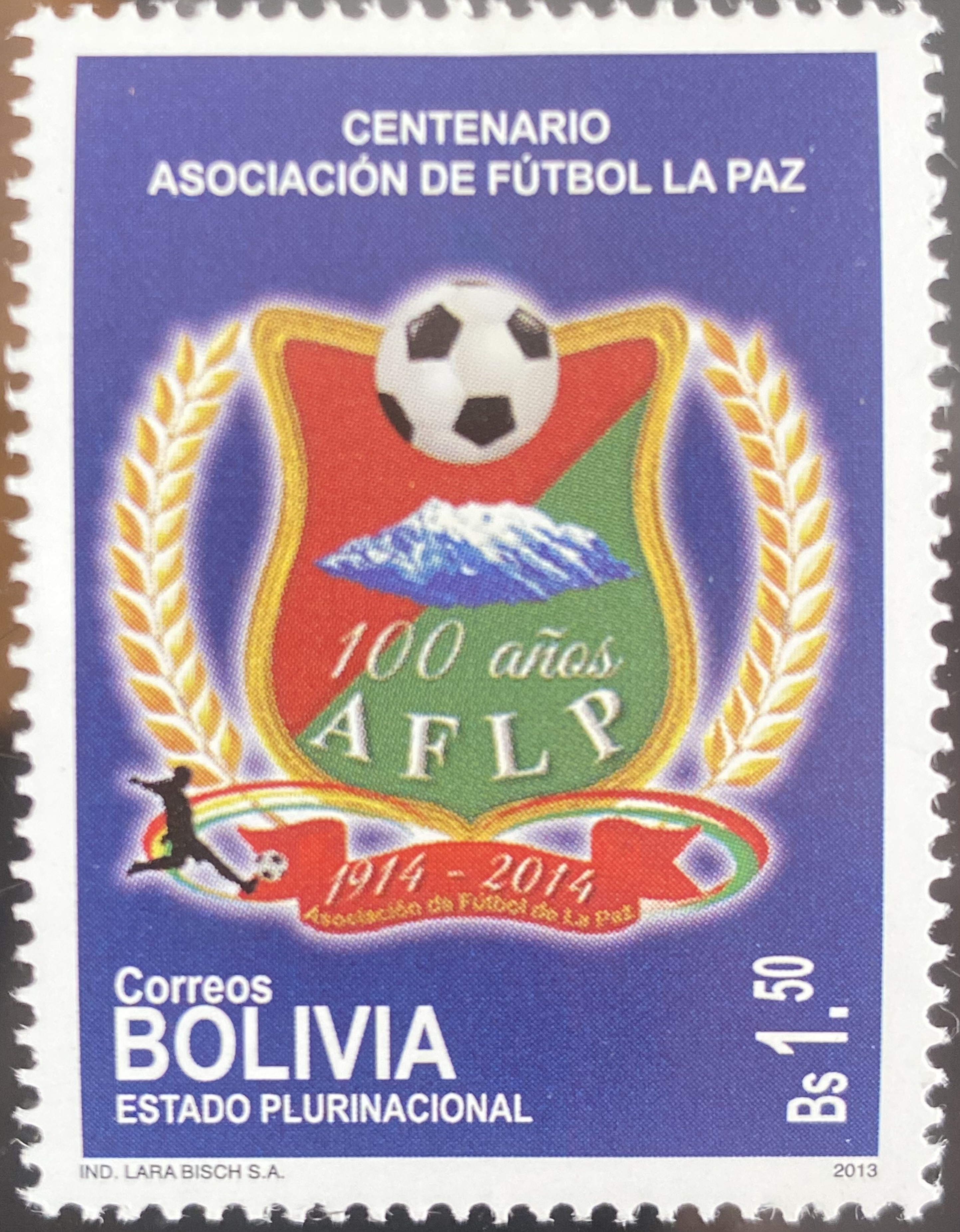 1 sello dedicado al centenario de la Asociación decana del fútbol nacional, la Asociación de Fútbol de La Paz 1914-2014. En 1914 se jugó el primer torneo de fútbol oficial en el país, cuyo ganador fue The Strongest. La AFLP fue además la organizadora de los primeros torneos del fútbol profesional boliviano en el periodo 1950-1959.