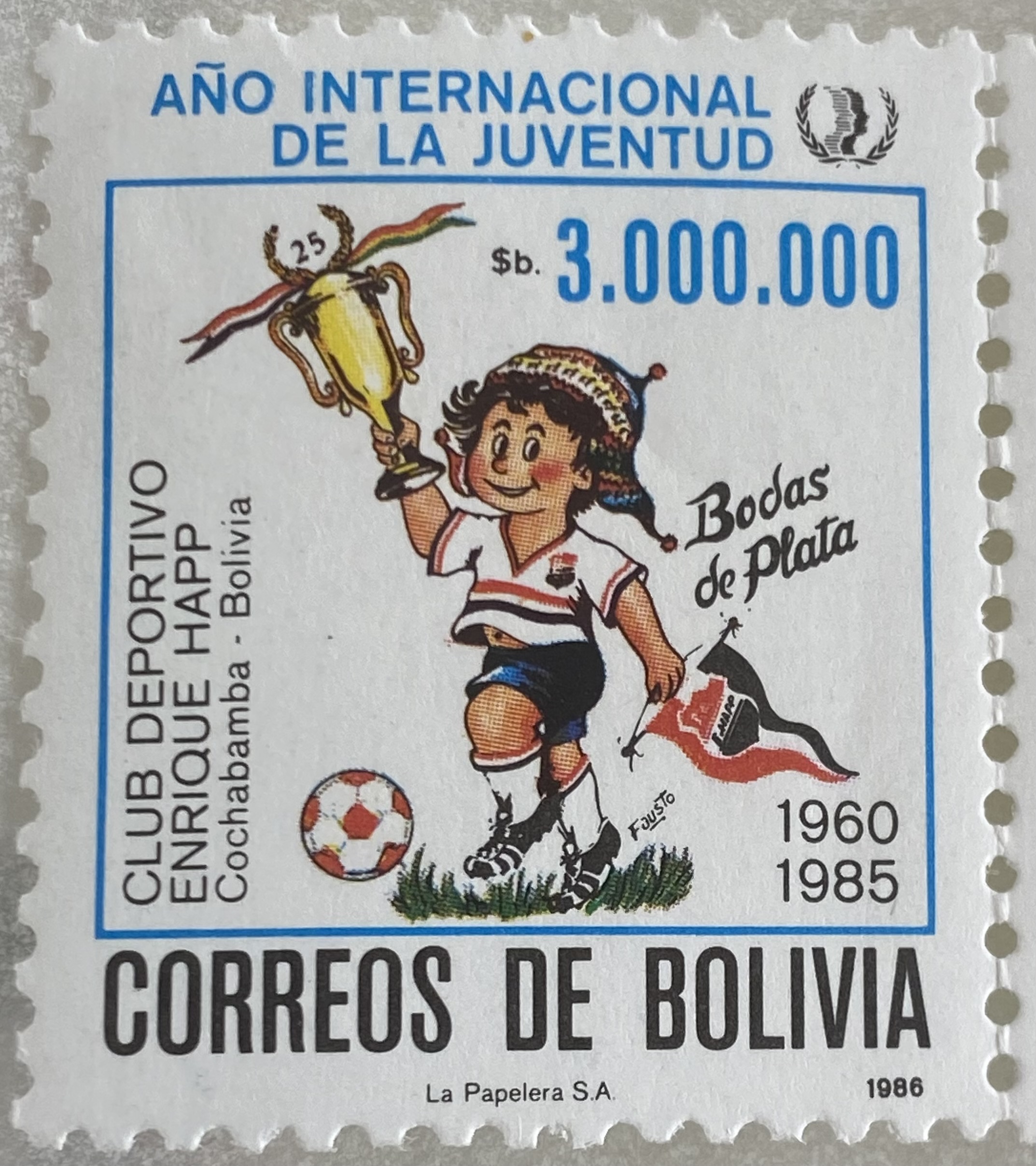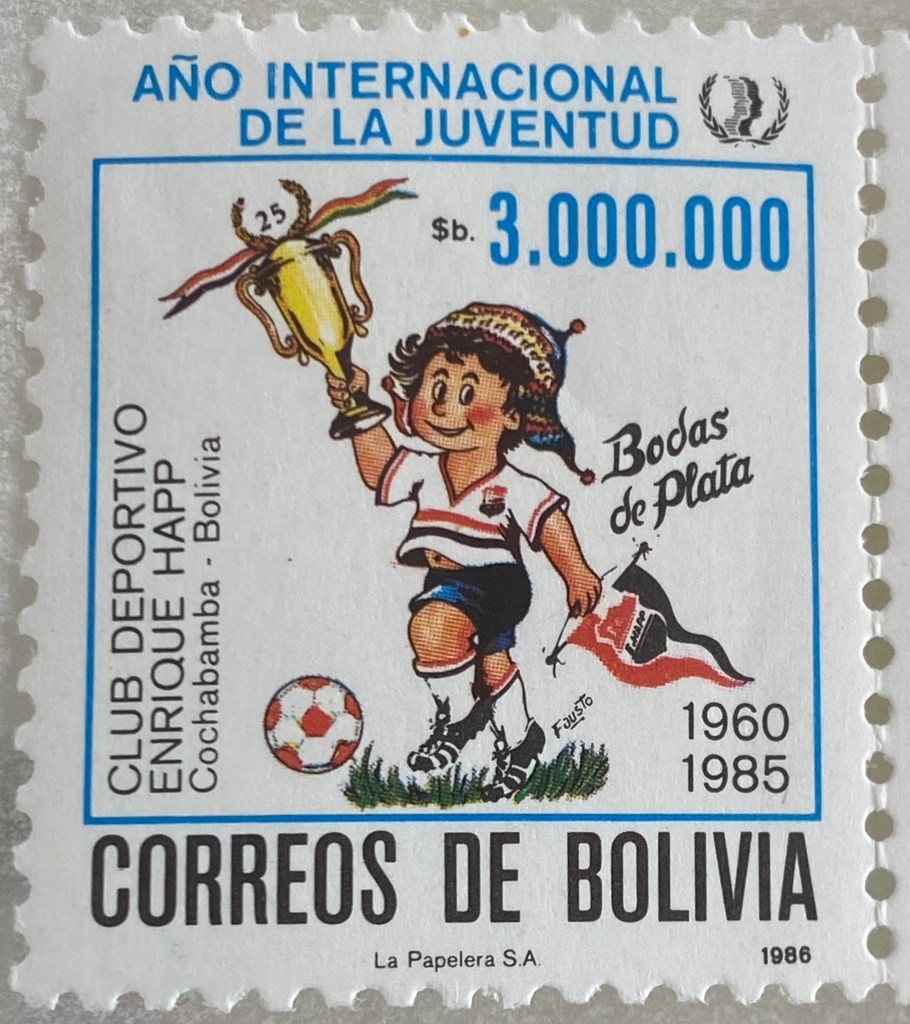 1 estampilla en honor de la Academia-Club Enrique Happ de Cochabamba en ocasión de sus bodas de plata (25 años) 1960-1985. Refiere también la conmemoración del año internacional de la juventud. Como anécdota, es el sello dedicado al fútbol nacional de mayor valor facial 3.000.000 bs. (tres millones de bolivianos), que tiene que ver con el agudo periodo hiperinflacionario que vivió el país en ese periodo histórico.