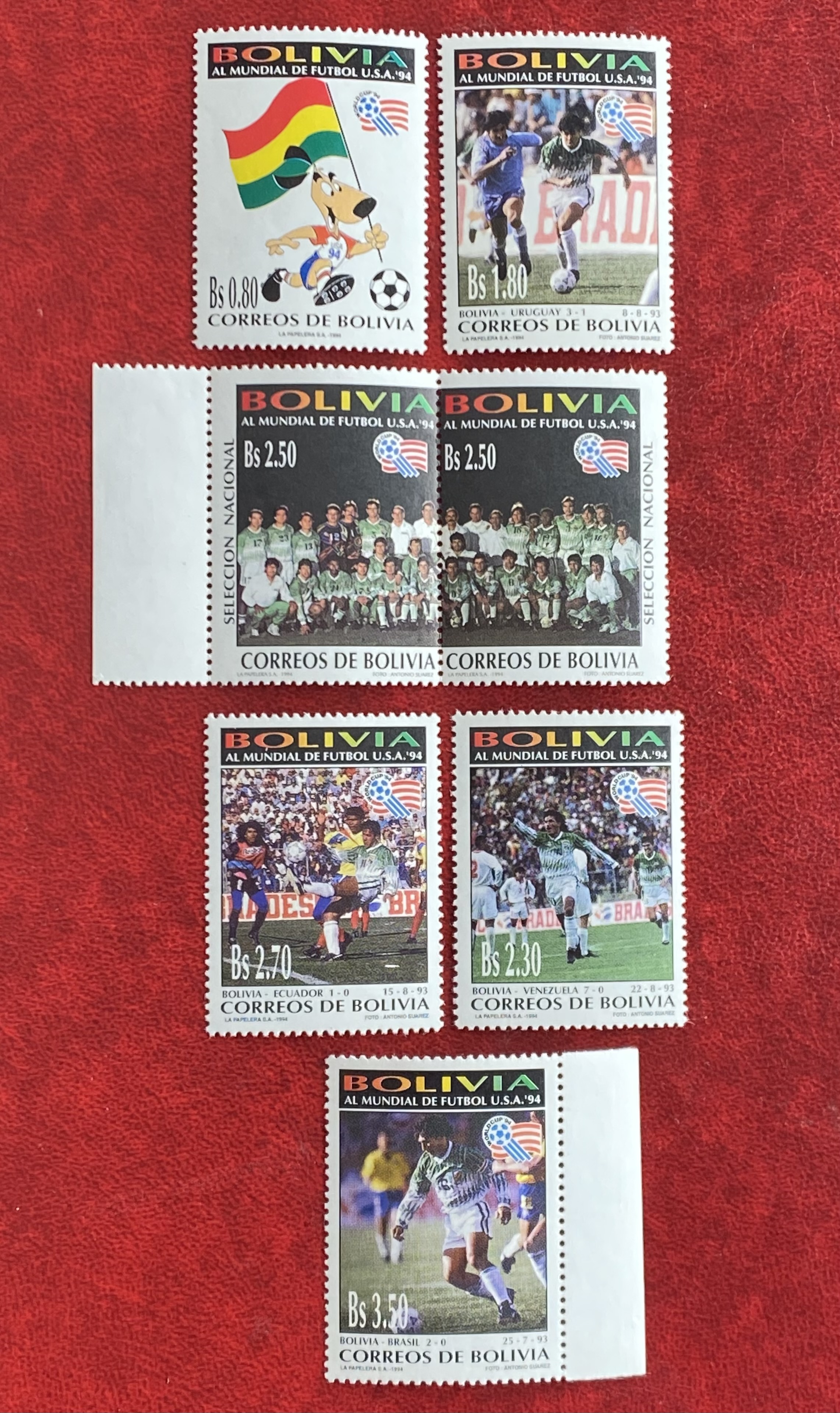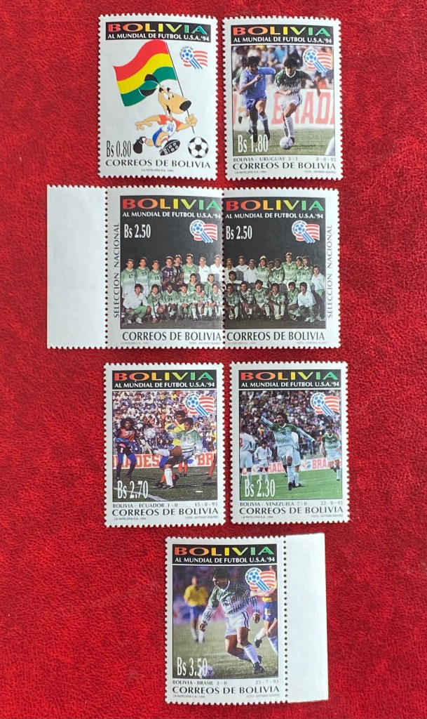 Serie de 8 estampillas de homenaje a la selección que clasificó a Bolivia al Mundial de Estados Unidos. El primero, la mascota oficial del torneo con la bandera nacional. Se escogieron los 5 partidos jugados en La Paz para incluirlos en esta serie. El segundo sello, el partido que Bolivia ganó a Uruguay 3 a 1 (en la imagen Erwin Sánchez),