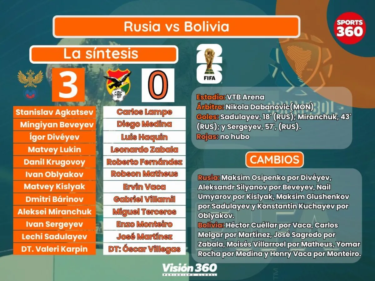 Lechi Sadulayev (18’), Aleksei Miranchuk (43’) e Ivan Sergeyev (57’) hicieron los goles del triunfo ruso ante una Bolivia que no se achicó, que trató de luchar de tú a tú ante una potente selección europea.